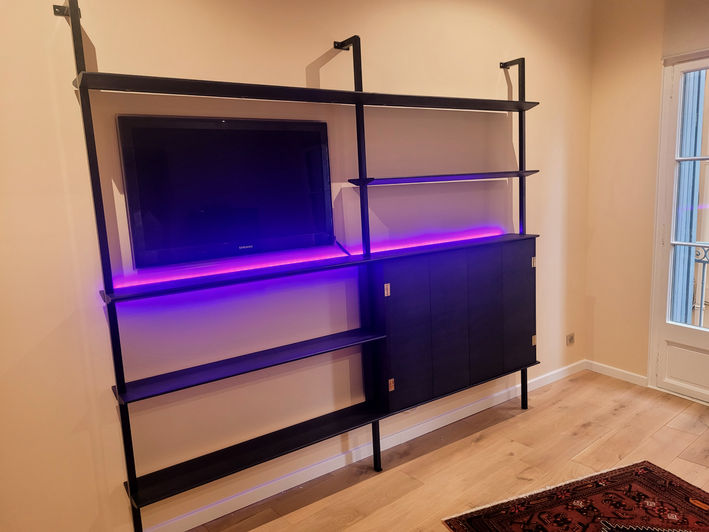 This is a shelving unit I built and then transported to Perpignan, France. The design is simply in concept but complex in execution with subtle details that I'm proud of. The sub-structure is made of powder-coated steel and the timber elements are Ash stained black. The cabinet was put into the bottom right to maintain the symmetry of the television in the top left. Its a bi-fold door system made with hardware I made myself, due to the lack of availability, bulkiness and massive cost of available bi-fold systems. Overall, I find the look of the piece very pleasing and I was delighted to be involved in the project.